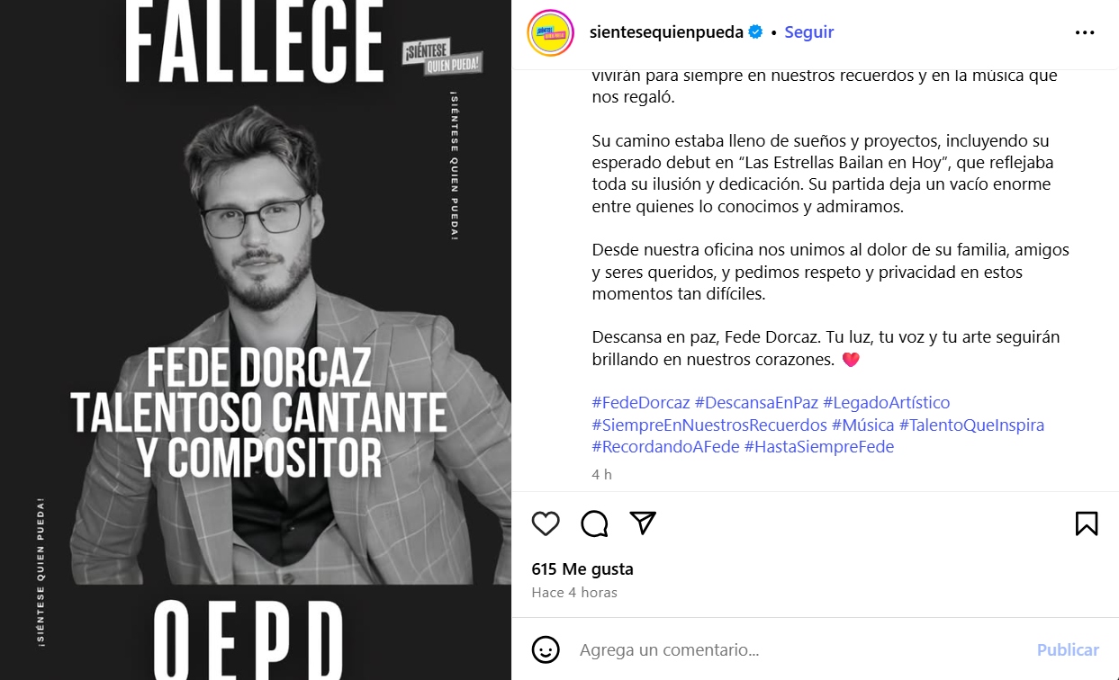 El popular programa ¡Siéntese quien pueda! informó en sus redes sociales sobre la muerte del cantante, cuya pareja es la venezolana Mariana Ávila. «Con profundo dolor despedimos a Fede Dorcaz», indicó.