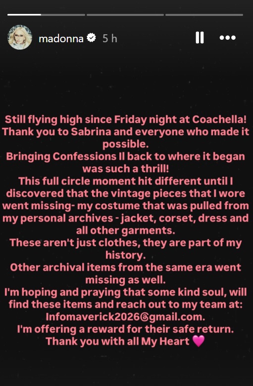 (EFE).- La leyenda del pop Madonna ofrece desde este lunes una recompensa para recuperar el icónico atuendo que lució este fin de semana en su sorpresiva aparición en el festival Coachella como artista invitada de Sabrina Carpenter.