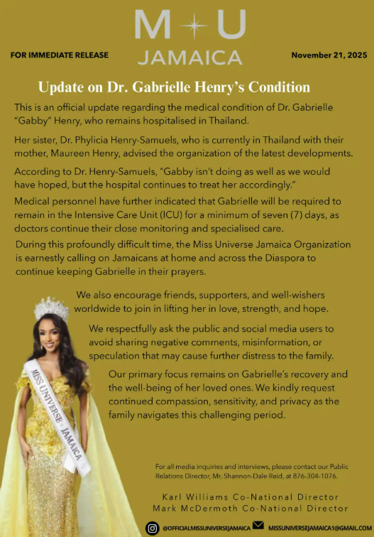 «Mientras los médicos continúan con su estrecha vigilancia y atención especializada. En estos momentos tan difíciles, la Organización Miss Universo Jamaica hace un ferviente llamado a los jamaicanos, tanto en su país como en la diáspora, a que sigan orando por Gabrielle», agregaron en el texto.