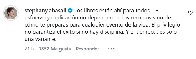 «Los libros están ahí para todos… El esfuerzo y dedicación no dependen de los recursos sino de cómo te preparas para cualquier evento de la vida», indicó Abasali en un mensaje divulgado en sus redes sociales.