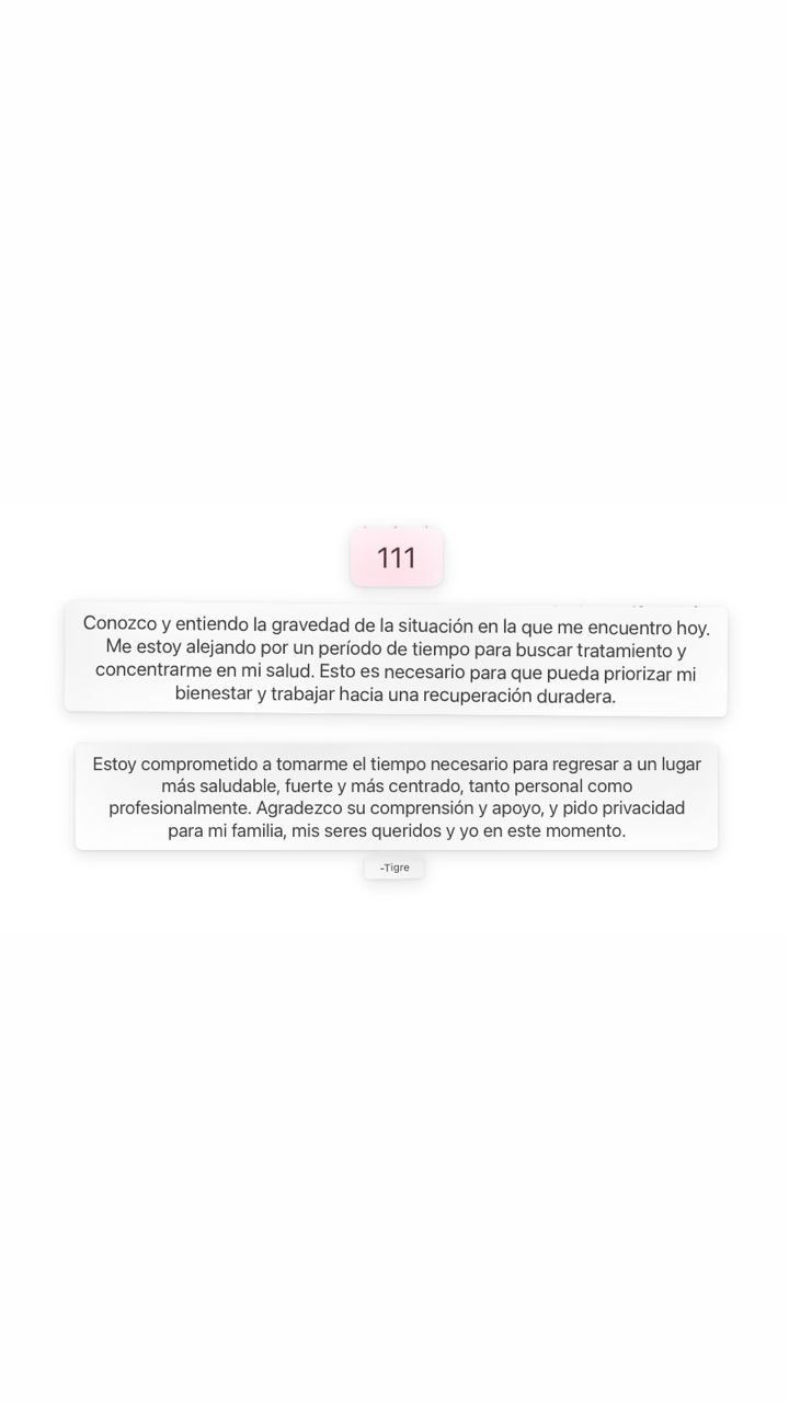 «Soy consciente de la gravedad de la situación en la que estoy. Me aparto por un tiempo para recibir tratamiento y centrarme en mi salud. Es necesario para priorizar mi bienestar y trabajar hacia una recuperación duradera», dijo Woods en un comunicado.