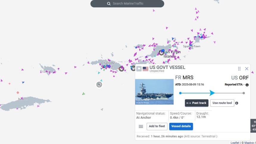 Datos de la plataforma de monitoreo marítimo Marine Traffic confirmaron este lunes que el portaaviones abandonó la costa de Charlotte Amalie, en St. Thomas, para retomar operaciones en dirección al sur.