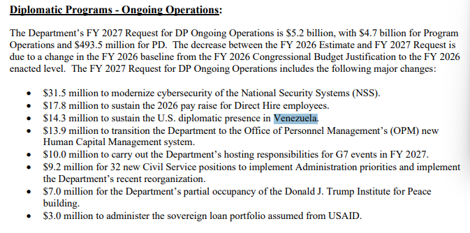 El Departamento de Estado solicitó al Congreso de Estados Unidos un presupuesto de 14,3 millones de dólares para el funcionamiento de su embajada en Venezuela para 2027.