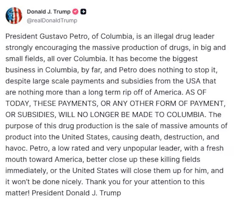 «Petro, un líder poco reconocido y muy impopular, con una actitud fresca hacia Estados Unidos, debería cerrar estos campos de exterminio de inmediato, o Estados Unidos se los cerrará, y no será bien recibido. ¡Gracias por su atención a este asunto!», concluyó el jefe de Estado norteamericano.