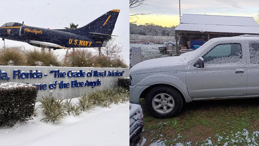 Durante las primeras horas del día, localidades como Laurel Hill, DeFuniak Springs, Chipley, Marianna, Crestview, Pace y Navarre Beach registraron copos gruesos y persistentes, de acuerdo con reportes de Fox News.
