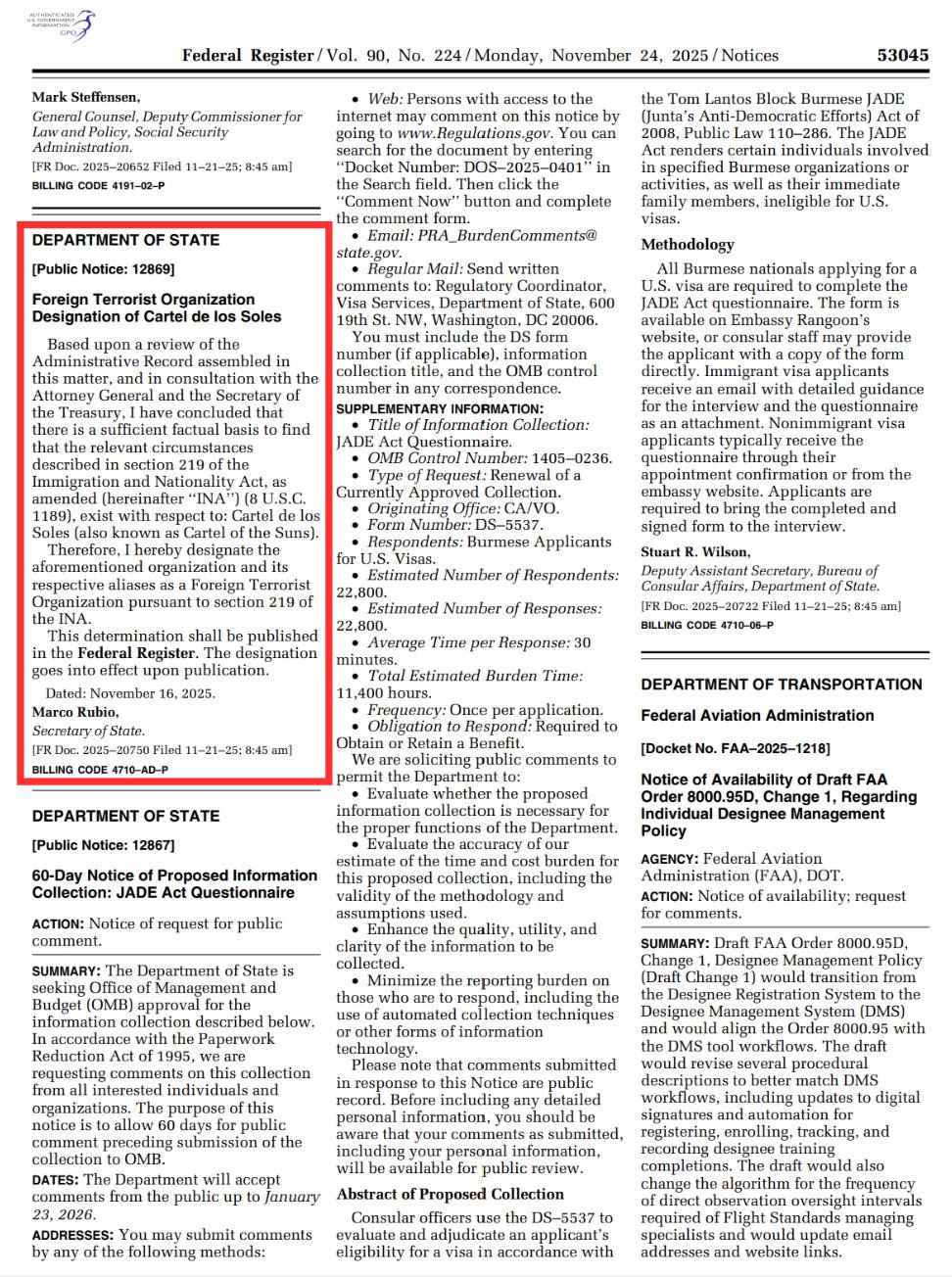 El secretario de Estado estadounidense, Marco Rubio, ya anunció el pasado 16 de noviembre que, según el Gobierno de Donald Trump, «existe una base fáctica suficiente» que demuestra que el Cartel de los Soles cumple con las condiciones descritas en la ley de inmigración y nacionalidad que regula la designación de FTOs.