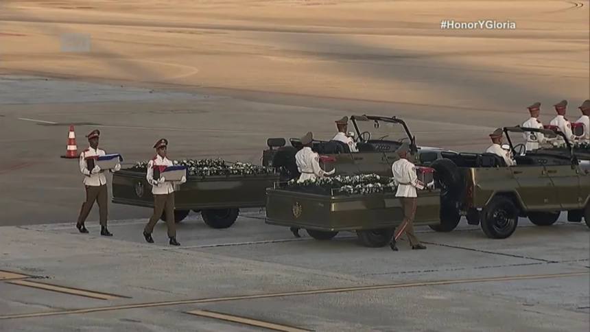 Los cuerpos llegaron en avión sobre las 7 de la mañana (11.00 GMT) al aeropuerto internacional José Martí de la capital, donde les esperaban el presidente cubano, Miguel Díaz-Canel, su predecesor, Raúl Castro, y varios ministros y autoridades del país.