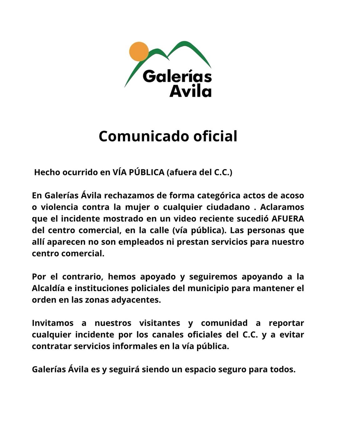 «Invitamos a nuestros visitantes y comunidad a reportar cualquier incidente por los canales oficiales del centro comercial y a evitar contratar servicios informales en la vía pública. Galerías Ávila es y seguirá siendo un espacio seguro para todos», sentenció.
