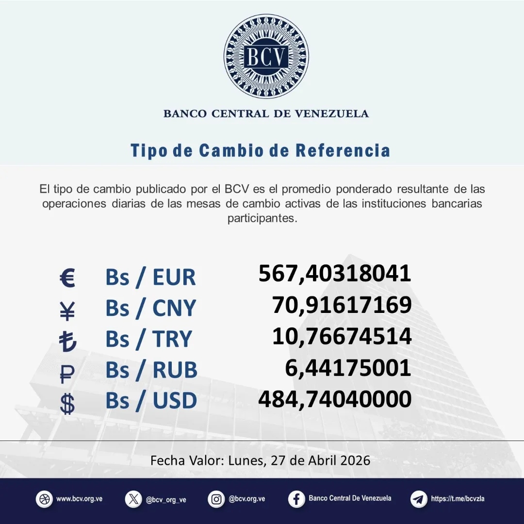 El dólar oficial inició la jornada de este 27 de abril con tendencia alcista al cotizarse en Bs. 484,74.