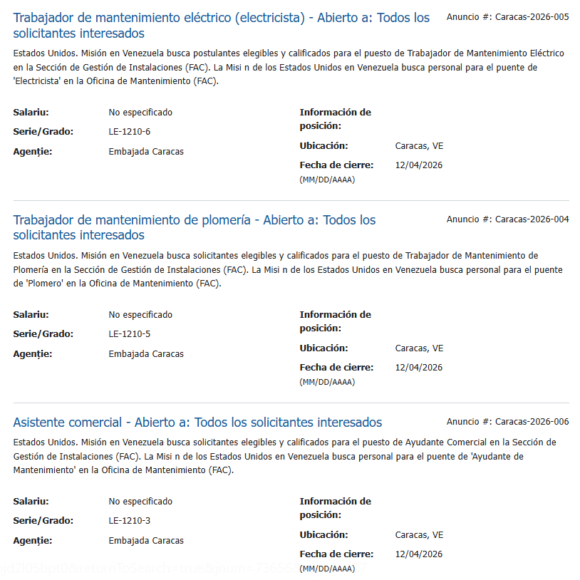 El anuncio que hizo la Embajada de EEUU sobre las vacantes laborales en Caracas