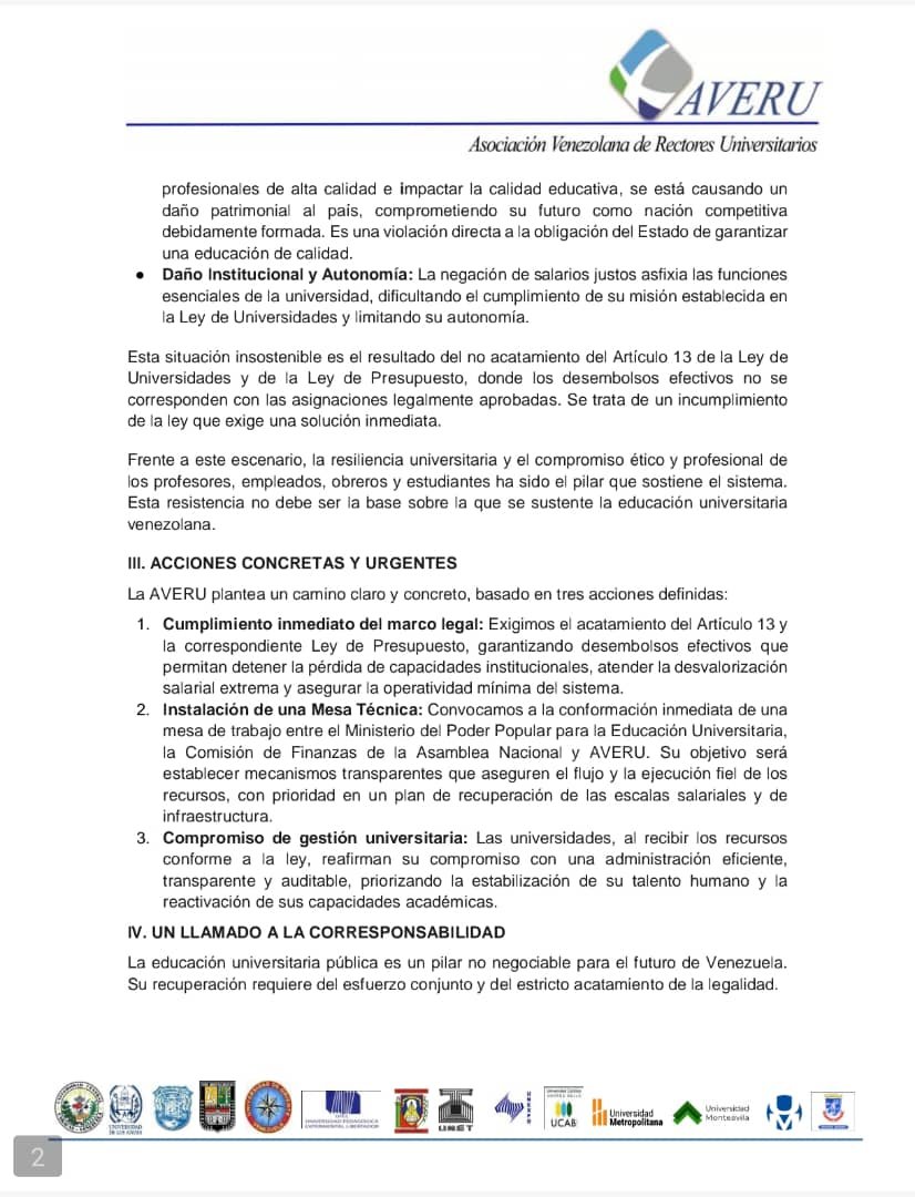 «La educación universitaria pública es un pilar no negociable para el futuro de Venezuela. Su recuperación requiere del esfuerzo conjunto y del estricto acatamiento de la legalidad», añadieron en la misiva.