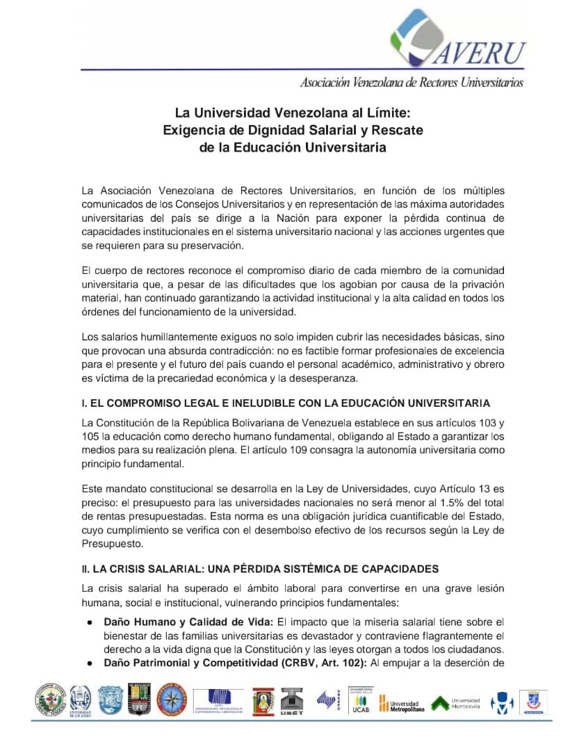 La Asociación Venezolana de Rectores Universitarios (Averu), emitió un comunicado para respaldar las acciones de la comunidad universitaria que exige mejoras salariales en un sector clave para el desarrollo nacional.