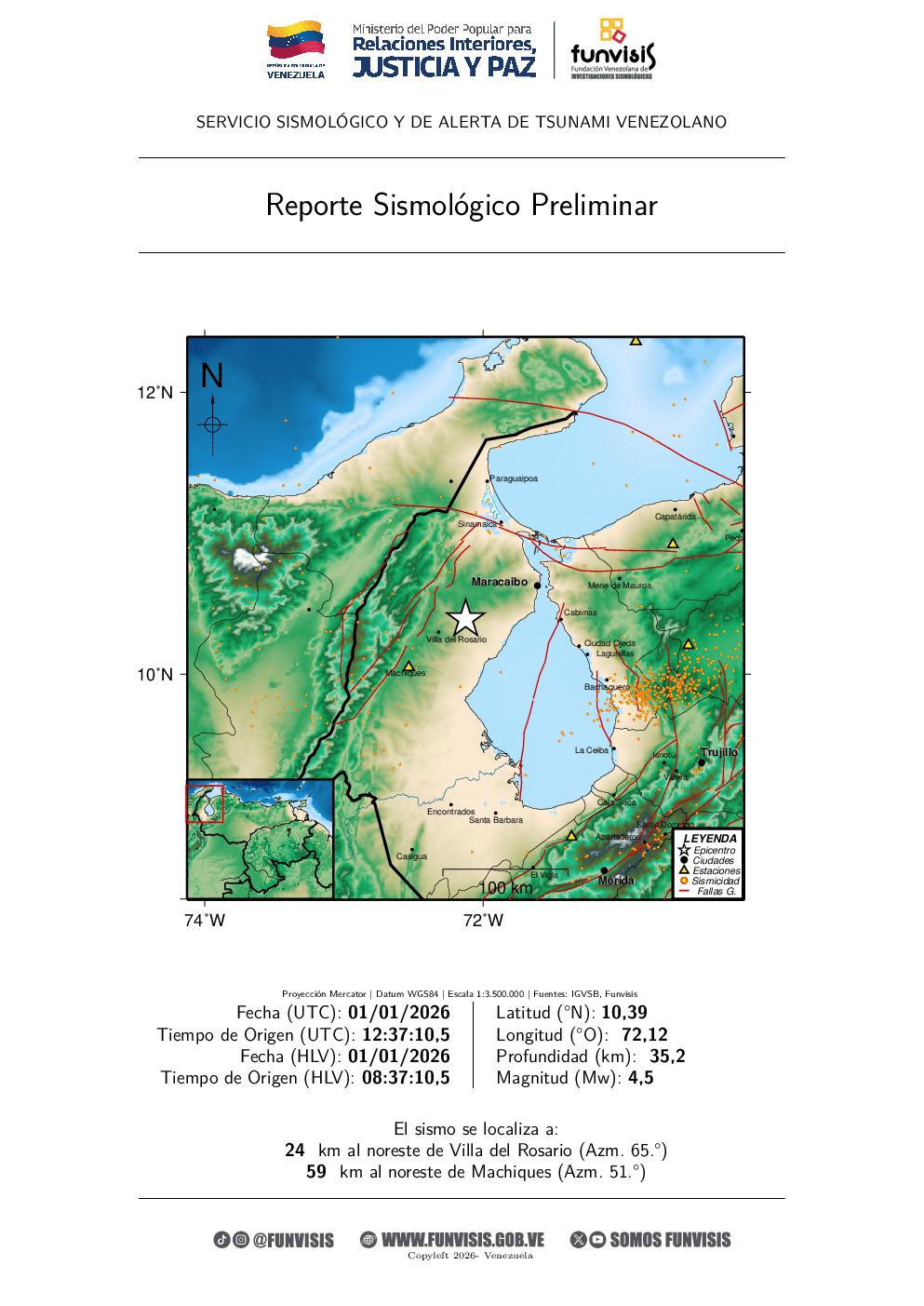 El sismo ocurrió a las 8:37 de la mañana y tuvo una magnitud de 4,5 grados. Funvisis detalló que se se dio a una profundidad de 35 kilómetros y a 23 kilómetros de la localidad Villa del Rosario, en Zulia.