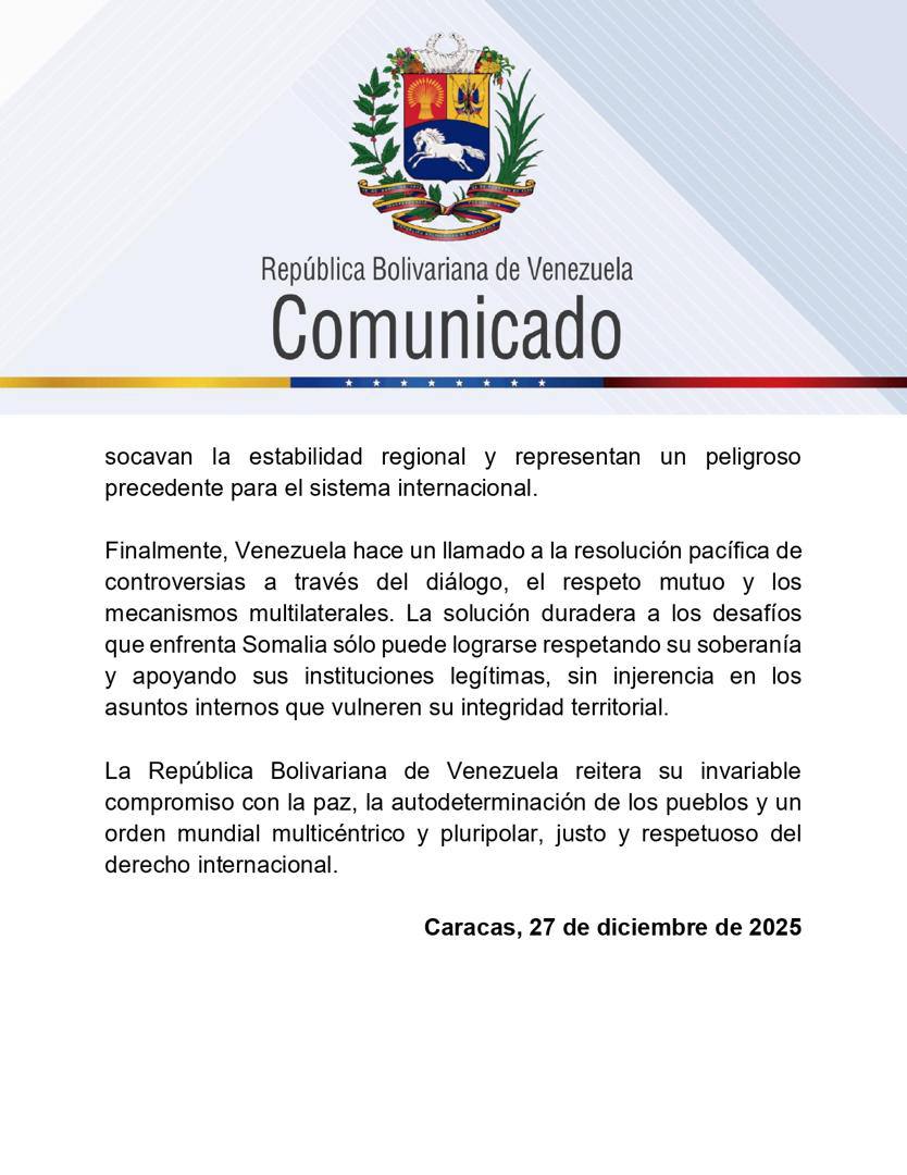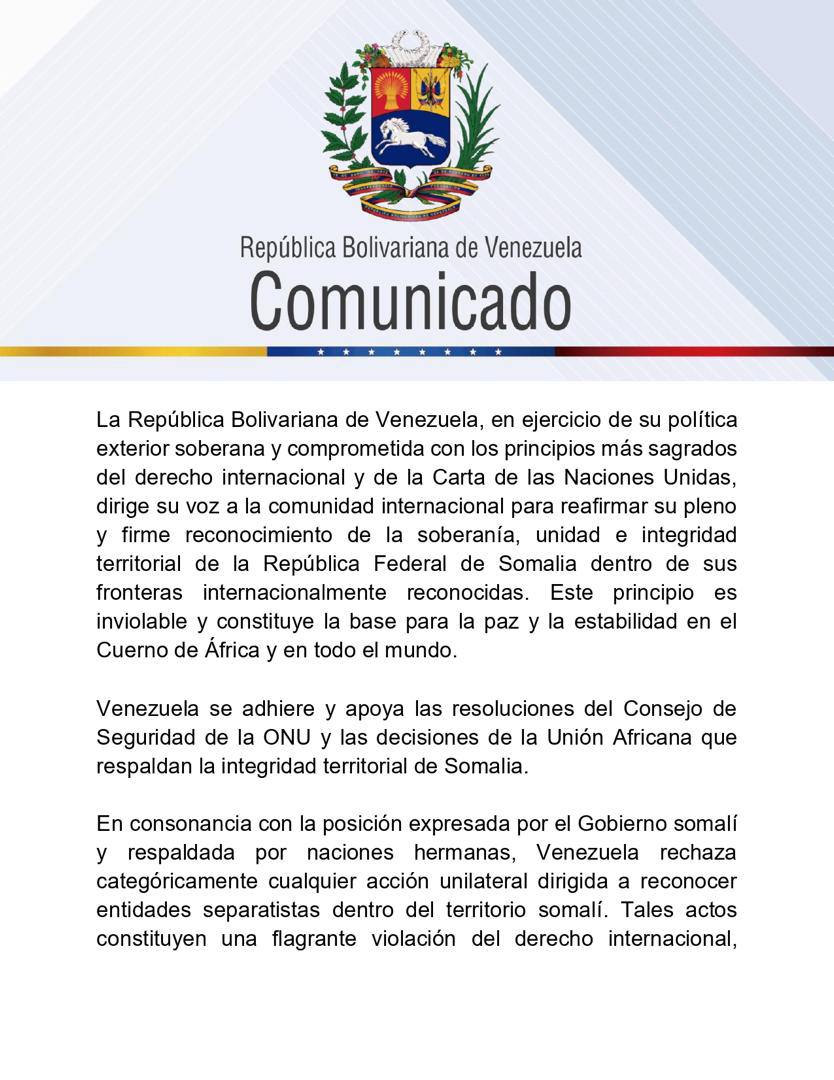 (EFE).- El Gobierno de Venezuela reafirmó este sábado su «pleno y firme reconocimiento» a la soberanía y unidad de Somalia, así como su rechazo a «cualquier acción unilateral dirigida a reconocer entidades separatistas» dentro de su territorio, luego de que Israel reconociera como Estado independiente a Somalilandia, región norteña del país africano.